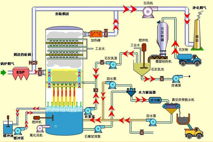 “石灰石-石膏”濕法脫硫工藝鍋爐引風機排出的原煙氣由增壓風機導入脫硫系統(tǒng),通過GGH(氣體加熱器)進行熱交換后煙氣進入吸收塔。鍋爐引風機排出的原煙氣由增壓風機導入脫硫系統(tǒng),通過GGH(氣體加熱器)進行熱交換后煙氣進入吸收塔。在吸收塔內(nèi),原煙氣自下而上通過塔身,遇噴淋系統(tǒng)噴出的霧狀石灰石漿液逆流混合,脫硫后的凈煙氣經(jīng)噴淋系統(tǒng)上部的除霧器除去煙氣所攜帶的霧滴后排除吸收塔進入GGH,經(jīng)過GGH換熱升溫后經(jīng)煙囪排出。