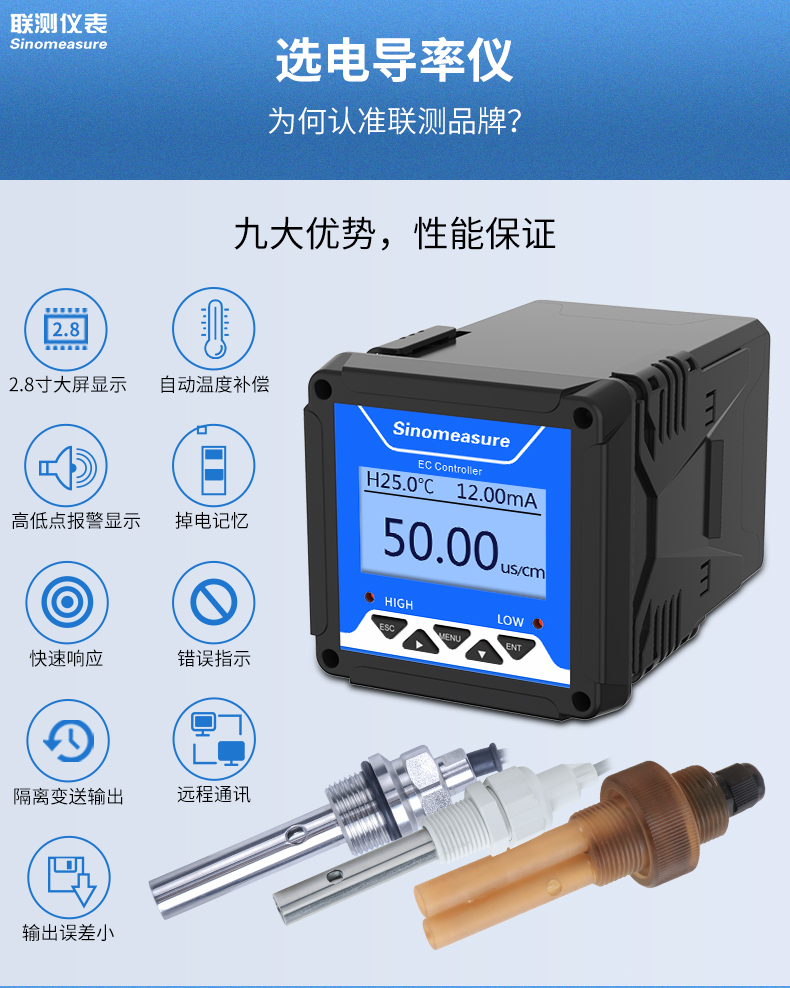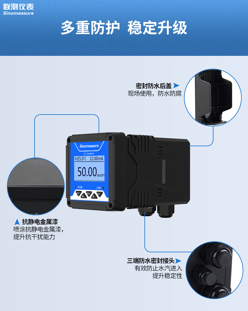 聯(lián)測(cè)儀表SIN-TDS210-C工業(yè)電導(dǎo)率儀表,廣泛應(yīng)用于火電、化工化肥、冶金、環(huán)保、制藥、生 化、食品和自來(lái)水等行業(yè)??刂破髦饕獙?duì)溶液中的電導(dǎo)率/總?cè)芙夤腆w/ 電阻率和溫度進(jìn)行連續(xù)監(jiān)測(cè)。
