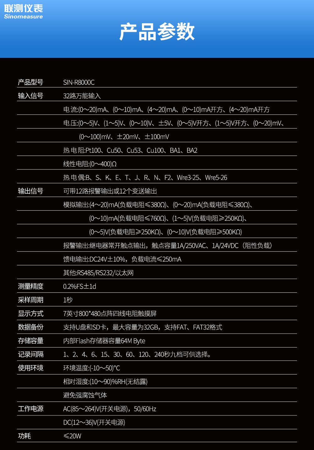 聯(lián)測儀表SIN-R8000C可帶12路報(bào)警輸出或12個(gè)變送輸出,RS232/485通訊接口,以太網(wǎng)接口,微型打印機(jī)接口和USB接口,SD卡插座;可提供傳感器配電;采用拔插式間距為5.08的接線端子,方便電氣連接;具有強(qiáng)大的顯示功能,實(shí)時(shí)曲線顯示,歷史曲線追憶,棒圖顯示等。人性化的外觀設(shè)計(jì)、完美的功能體現(xiàn)、可靠的硬件品質(zhì)、精湛的制造工藝,使本產(chǎn)品具有更高的性能價(jià)格比。