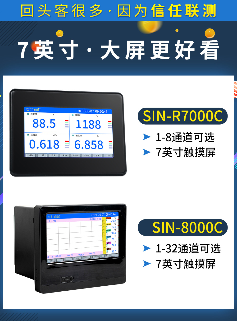 聯(lián)測儀表SIN-R7000C觸摸屏7英寸無紙記錄儀1-8路可選