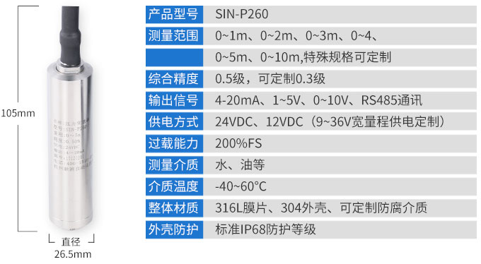 SIN-P260投入式液位變送器由高性能擴散硅壓阻式壓力傳感器作為測量元件,把與液位深度成正比的液體靜壓力準(zhǔn)確測量出來。